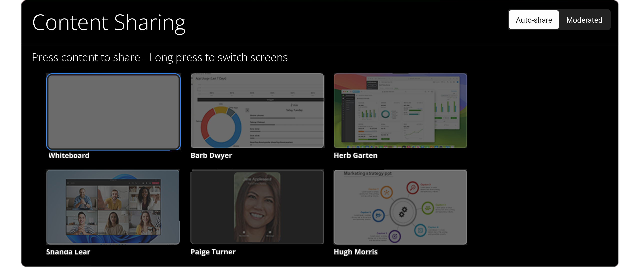 - Moderated — The Moderator app user must select participant-shared content on the Sharing panel to make it visible on the room display.