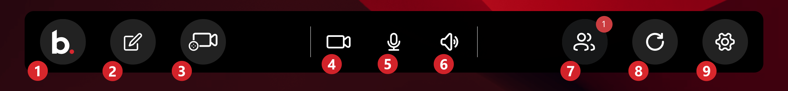 The black ribbon near the bottom of the home screen contains the meeting controls, settings options, and status indicators.